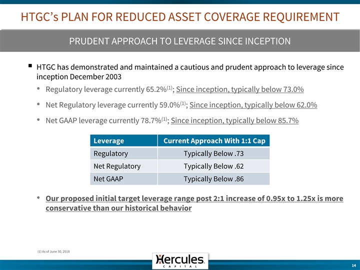 HTGC PLAN FOR REDUCED ASSET COVERAGE REQUIREMENT KEY ELEMENTS • No Change to our “first position” senior secured investment focus and historical loan portfolio orientation with attractive risk-adjusted yields • No Change to our direct origination venture-lending focus or thematic investment underwriting • Expect to maintain investment grade credit ratings by pursuing modest levels of incremental increased leverage of 0.95x to 1.25x debt-to-equity • Incremental increased leverage will enhance greater portfolio diversification and investment capabilities • Potential to generate incremental annual increases in ROAAs and ROAEs for stockholders Obtaining regulatory relief in conjunction with a revised financial operating leverage guidelines of 0.95x to 1.25x debt to equity ratio will allow HTGC to drive incremental ROAEs while maintaining an investment grade rating profile 13HTGC PLAN FOR REDUCED ASSET COVERAGE REQUIREMENT KEY ELEMENTS • No Change to our “first position” senior secured investment focus and historical loan portfolio orientation with attractive risk-adjusted yields • No Change to our direct origination venture-lending focus or thematic investment underwriting • Expect to maintain investment grade credit ratings by pursuing modest levels of incremental increased leverage of 0.95x to 1.25x debt-to-equity • Incremental increased leverage will enhance greater portfolio diversification and investment capabilities • Potential to generate incremental annual increases in ROAAs and ROAEs for stockholders Obtaining regulatory relief in conjunction with a revised financial operating leverage guidelines of 0.95x to 1.25x debt to equity ratio will allow HTGC to drive incremental ROAEs while maintaining an investment grade rating profile 13