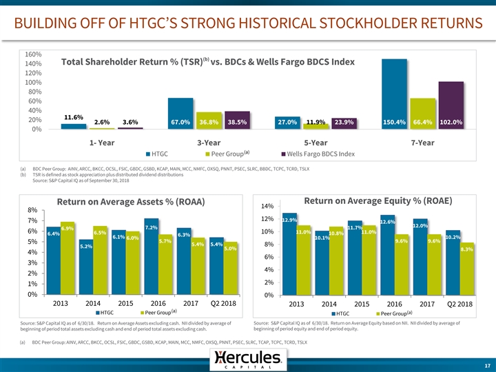 BUILDING OFF OF HTGC’S STRONG HISTORICAL STOCKHOLDER RETURNS 160% (b) Total Shareholder Return % (TSR) vs. BDCs & Wells Fargo BDCS Index 140% 120% 100% 80% 60% 40% 11.6% 20% 2.6% 3.6% 67.0% 36.8% 38.5% 27.0% 11.9% 23.9% 150.4% 66.4% 102.0% 0% 1- Year 3-Year 5-Year 7-Year (a) HTGC Peer Group Wells Fargo BDCS Index (a) BDC Peer Group: AINV, ARCC, BKCC, OCSL, FSIC, GBDC, GSBD, KCAP, MAIN, MCC, NMFC, OXSQ, PNNT, PSEC, SLRC, BBDC, TCPC, TCRD, TSLX (b) TSR is defined as stock appreciation plus distributed dividend distributions Source: S&P Capital IQ as of September 30, 2018 Return on Average Equity % (ROAE) Return on Average Assets % (ROAA) 14% 8% 12% 12.9% 7% 12.6% 12.0% 7.2% 11.7% 6.9% 6% 10% 6.5% 11.0% 11.0% 10.8% 6.4% 6.3% 6.1% 10.2% 6.0% 10.1% 9.6% 9.6% 5.7% 5% 5.4% 5.4% 8% 5.2% 5.0% 8.3% 4% 6% 3% 4% 2% 2% 1% 0% 0% 2013 2014 2015 2016 2017 Q2 2018 2013 2014 2015 2016 2017 Q2 2018 (a) (a) HTGC Peer Group HTGC Peer Group Source: S&P Capital IQ as of 6/30/18. Return on Average Equity based on NII. NII divided by average of Source: S&P Capital IQ as of 6/30/18. Return on Average Assets excluding cash. NII divided by average of beginning of period total assets excluding cash and end of period total assets excluding cash. beginning of period equity and end of period equity. (a) BDC Peer Group: AINV, ARCC, BKCC, OCSL, FSIC, GBDC, GSBD, KCAP, MAIN, MCC, NMFC, OXSQ, PNNT, PSEC, SLRC, TCAP, TCPC, TCRD, TSLX 17BUILDING OFF OF HTGC’S STRONG HISTORICAL STOCKHOLDER RETURNS 160% (b) Total Shareholder Return % (TSR) vs. BDCs & Wells Fargo BDCS Index 140% 120% 100% 80% 60% 40% 11.6% 20% 2.6% 3.6% 67.0% 36.8% 38.5% 27.0% 11.9% 23.9% 150.4% 66.4% 102.0% 0% 1- Year 3-Year 5-Year 7-Year (a) HTGC Peer Group Wells Fargo BDCS Index (a) BDC Peer Group: AINV, ARCC, BKCC, OCSL, FSIC, GBDC, GSBD, KCAP, MAIN, MCC, NMFC, OXSQ, PNNT, PSEC, SLRC, BBDC, TCPC, TCRD, TSLX (b) TSR is defined as stock appreciation plus distributed dividend distributions Source: S&P Capital IQ as of September 30, 2018 Return on Average Equity % (ROAE) Return on Average Assets % (ROAA) 14% 8% 12% 12.9% 7% 12.6% 12.0% 7.2% 11.7% 6.9% 6% 10% 6.5% 11.0% 11.0% 10.8% 6.4% 6.3% 6.1% 10.2% 6.0% 10.1% 9.6% 9.6% 5.7% 5% 5.4% 5.4% 8% 5.2% 5.0% 8.3% 4% 6% 3% 4% 2% 2% 1% 0% 0% 2013 2014 2015 2016 2017 Q2 2018 2013 2014 2015 2016 2017 Q2 2018 (a) (a) HTGC Peer Group HTGC Peer Group Source: S&P Capital IQ as of 6/30/18. Return on Average Equity based on NII. NII divided by average of Source: S&P Capital IQ as of 6/30/18. Return on Average Assets excluding cash. NII divided by average of beginning of period total assets excluding cash and end of period total assets excluding cash. beginning of period equity and end of period equity. (a) BDC Peer Group: AINV, ARCC, BKCC, OCSL, FSIC, GBDC, GSBD, KCAP, MAIN, MCC, NMFC, OXSQ, PNNT, PSEC, SLRC, TCAP, TCPC, TCRD, TSLX 17