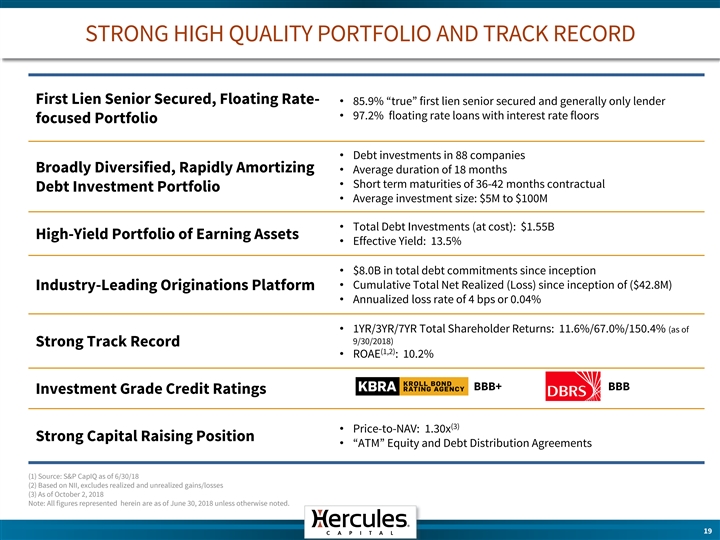 STRONG HIGH QUALITY PORTFOLIO AND TRACK RECORD First Lien Senior Secured, Floating Rate- • 85.9% “true” first lien senior secured and generally only lender • 97.2% floating rate loans with interest rate floors focused Portfolio • Debt investments in 88 companies Broadly Diversified, Rapidly Amortizing • Average duration of 18 months • Short term maturities of 36-42 months contractual Debt Investment Portfolio • Average investment size: $5M to $100M • Total Debt Investments (at cost): $1.55B High-Yield Portfolio of Earning Assets • Effective Yield: 13.5% • $8.0B in total debt commitments since inception • Cumulative Total Net Realized (Loss) since inception of ($42.8M) Industry-Leading Originations Platform • Annualized loss rate of 4 bps or 0.04% • 1YR/3YR/7YR Total Shareholder Returns: 11.6%/67.0%/150.4% (as of 9/30/2018) Strong Track Record (1,2) • ROAE : 10.2% BBB+ BBB Investment Grade Credit Ratings (3) • Price-to-NAV: 1.30x Strong Capital Raising Position • “ATM” Equity and Debt Distribution Agreements (1) Source: S&P CapIQ as of 6/30/18 (2) Based on NII, excludes realized and unrealized gains/losses (3) As of October 2, 2018 Note: All figures represented herein are as of June 30, 2018 unless otherwise noted. 19STRONG HIGH QUALITY PORTFOLIO AND TRACK RECORD First Lien Senior Secured, Floating Rate- • 85.9% “true” first lien senior secured and generally only lender • 97.2% floating rate loans with interest rate floors focused Portfolio • Debt investments in 88 companies Broadly Diversified, Rapidly Amortizing • Average duration of 18 months • Short term maturities of 36-42 months contractual Debt Investment Portfolio • Average investment size: $5M to $100M • Total Debt Investments (at cost): $1.55B High-Yield Portfolio of Earning Assets • Effective Yield: 13.5% • $8.0B in total debt commitments since inception • Cumulative Total Net Realized (Loss) since inception of ($42.8M) Industry-Leading Originations Platform • Annualized loss rate of 4 bps or 0.04% • 1YR/3YR/7YR Total Shareholder Returns: 11.6%/67.0%/150.4% (as of 9/30/2018) Strong Track Record (1,2) • ROAE : 10.2% BBB+ BBB Investment Grade Credit Ratings (3) • Price-to-NAV: 1.30x Strong Capital Raising Position • “ATM” Equity and Debt Distribution Agreements (1) Source: S&P CapIQ as of 6/30/18 (2) Based on NII, excludes realized and unrealized gains/losses (3) As of October 2, 2018 Note: All figures represented herein are as of June 30, 2018 unless otherwise noted. 19