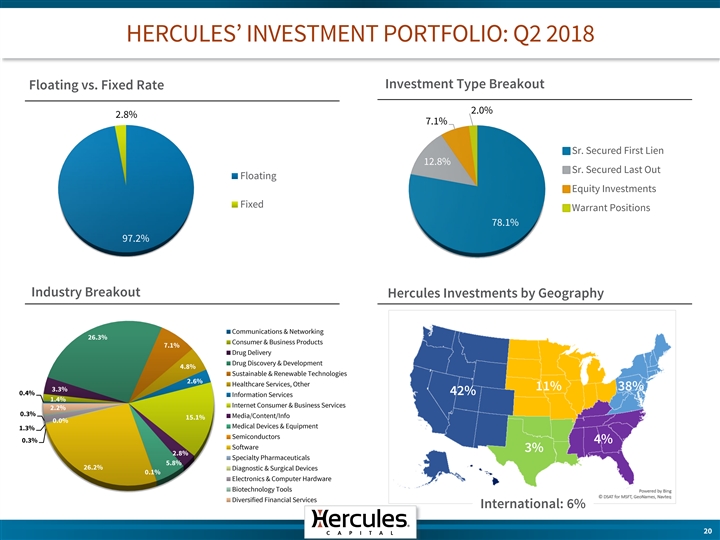 HERCULES’ INVESTMENT PORTFOLIO: Q2 2018 Investment Type Breakout Floating vs. Fixed Rate 2.0% 2.8% 7.1% Sr. Secured First Lien 12.8% Sr. Secured Last Out Floating Equity Investments Fixed Warrant Positions 78.1% 97.2% Industry Breakout Hercules Investments by Geography Communications & Networking 26.3% Consumer & Business Products 7.1% Drug Delivery Drug Discovery & Development 4.8% Sustainable & Renewable Technologies 2.6% Healthcare Services, Other 11% 38% 3.3% 0.4% 42% Information Services 1.4% Internet Consumer & Business Services 2.2% 0.3% Media/Content/Info 15.1% 0.0% Medical Devices & Equipment 1.3% Semiconductors 0.3% 4% Software 3% 2.8% Specialty Pharmaceuticals 5.8% 26.2% Diagnostic & Surgical Devices 0.1% Electronics & Computer Hardware Biotechnology Tools Diversified Financial Services International: 6% 20HERCULES’ INVESTMENT PORTFOLIO: Q2 2018 Investment Type Breakout Floating vs. Fixed Rate 2.0% 2.8% 7.1% Sr. Secured First Lien 12.8% Sr. Secured Last Out Floating Equity Investments Fixed Warrant Positions 78.1% 97.2% Industry Breakout Hercules Investments by Geography Communications & Networking 26.3% Consumer & Business Products 7.1% Drug Delivery Drug Discovery & Development 4.8% Sustainable & Renewable Technologies 2.6% Healthcare Services, Other 11% 38% 3.3% 0.4% 42% Information Services 1.4% Internet Consumer & Business Services 2.2% 0.3% Media/Content/Info 15.1% 0.0% Medical Devices & Equipment 1.3% Semiconductors 0.3% 4% Software 3% 2.8% Specialty Pharmaceuticals 5.8% 26.2% Diagnostic & Surgical Devices 0.1% Electronics & Computer Hardware Biotechnology Tools Diversified Financial Services International: 6% 20