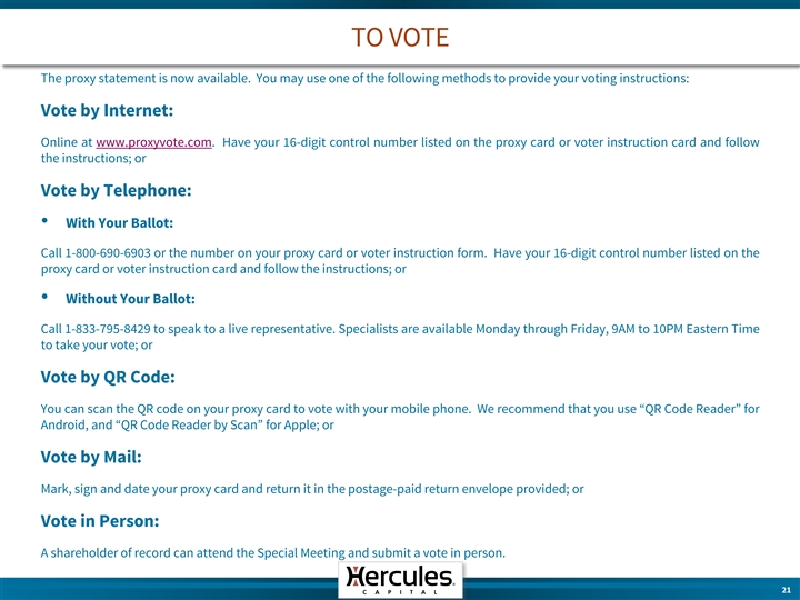 TO VOTE The proxy statement is now available. You may use one of the following methods to provide your voting instructions: Vote by Internet: Online at www.proxyvote.com. Have your 16-digit control number listed on the proxy card or voter instruction card and follow the instructions; or Vote by Telephone: • With Your Ballot: Call 1-800-690-6903 or the number on your proxy card or voter instruction form. Have your 16-digit control number listed on the proxy card or voter instruction card and follow the instructions; or • Without Your Ballot: Call 1-833-795-8429 to speak to a live representative. Specialists are available Monday through Friday, 9AM to 10PM Eastern Time to take your vote; or Vote by QR Code: You can scan the QR code on your proxy card to vote with your mobile phone. We recommend that you use “QR Code Reader” for Android, and “QR Code Reader by Scan” for Apple; or Vote by Mail: Mark, sign and date your proxy card and return it in the postage-paid return envelope provided; or Vote in Person: A shareholder of record can attend the Special Meeting and submit a vote in person. 21TO VOTE The proxy statement is now available. You may use one of the following methods to provide your voting instructions: Vote by Internet: Online at www.proxyvote.com. Have your 16-digit control number listed on the proxy card or voter instruction card and follow the instructions; or Vote by Telephone: • With Your Ballot: Call 1-800-690-6903 or the number on your proxy card or voter instruction form. Have your 16-digit control number listed on the proxy card or voter instruction card and follow the instructions; or • Without Your Ballot: Call 1-833-795-8429 to speak to a live representative. Specialists are available Monday through Friday, 9AM to 10PM Eastern Time to take your vote; or Vote by QR Code: You can scan the QR code on your proxy card to vote with your mobile phone. We recommend that you use “QR Code Reader” for Android, and “QR Code Reader by Scan” for Apple; or Vote by Mail: Mark, sign and date your proxy card and return it in the postage-paid return envelope provided; or Vote in Person: A shareholder of record can attend the Special Meeting and submit a vote in person. 21