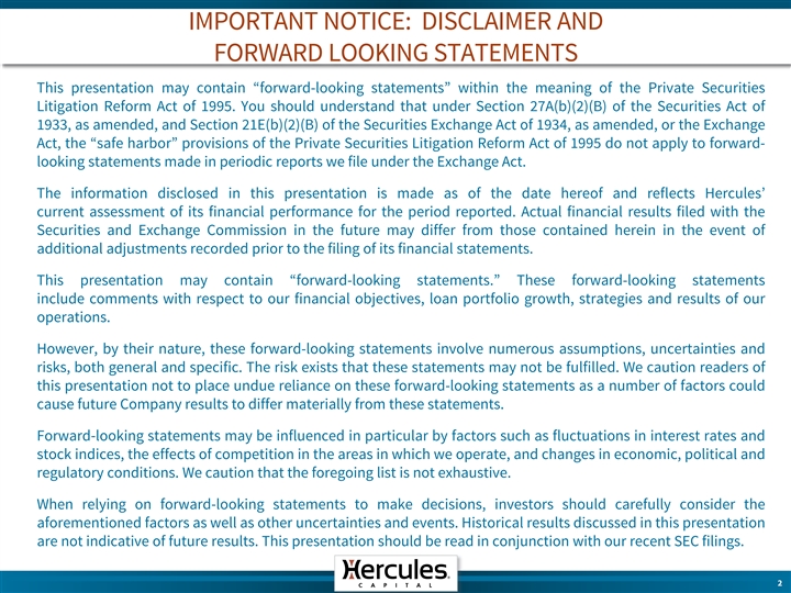 IMPORTANT NOTICE: DISCLAIMER AND FORWARD LOOKING STATEMENTS This presentation may contain “forward-looking statements” within the meaning of the Private Securities Litigation Reform Act of 1995. You should understand that under Section 27A(b)(2)(B) of the Securities Act of 1933, as amended, and Section 21E(b)(2)(B) of the Securities Exchange Act of 1934, as amended, or the Exchange Act, the “safe harbor” provisions of the Private Securities Litigation Reform Act of 1995 do not apply to forward- looking statements made in periodic reports we file under the Exchange Act. The information disclosed in this presentation is made as of the date hereof and reflects Hercules’ current assessment of its financial performance for the period reported. Actual financial results filed with the Securities and Exchange Commission in the future may differ from those contained herein in the event of additional adjustments recorded prior to the filing of its financial statements. This presentation may contain “forward-looking statements.” These forward-looking statements include comments with respect to our financial objectives, loan portfolio growth, strategies and results of our operations. However, by their nature, these forward-looking statements involve numerous assumptions, uncertainties and risks, both general and specific. The risk exists that these statements may not be fulfilled. We caution readers of this presentation not to place undue reliance on these forward-looking statements as a number of factors could cause future Company results to differ materially from these statements. Forward-looking statements may be influenced in particular by factors such as fluctuations in interest rates and stock indices, the effects of competition in the areas in which we operate, and changes in economic, political and regulatory conditions. We caution that the foregoing list is not exhaustive. When relying on forward-looking statements to make decisions, investors should carefully consider the aforementioned factors as well as other uncertainties and events. Historical results discussed in this presentation are not indicative of future results. This presentation should be read in conjunction with our recent SEC filings. 2IMPORTANT NOTICE: DISCLAIMER AND FORWARD LOOKING STATEMENTS This presentation may contain “forward-looking statements” within the meaning of the Private Securities Litigation Reform Act of 1995. You should understand that under Section 27A(b)(2)(B) of the Securities Act of 1933, as amended, and Section 21E(b)(2)(B) of the Securities Exchange Act of 1934, as amended, or the Exchange Act, the “safe harbor” provisions of the Private Securities Litigation Reform Act of 1995 do not apply to forward- looking statements made in periodic reports we file under the Exchange Act. The information disclosed in this presentation is made as of the date hereof and reflects Hercules’ current assessment of its financial performance for the period reported. Actual financial results filed with the Securities and Exchange Commission in the future may differ from those contained herein in the event of additional adjustments recorded prior to the filing of its financial statements. This presentation may contain “forward-looking statements.” These forward-looking statements include comments with respect to our financial objectives, loan portfolio growth, strategies and results of our operations. However, by their nature, these forward-looking statements involve numerous assumptions, uncertainties and risks, both general and specific. The risk exists that these statements may not be fulfilled. We caution readers of this presentation not to place undue reliance on these forward-looking statements as a number of factors could cause future Company results to differ materially from these statements. Forward-looking statements may be influenced in particular by factors such as fluctuations in interest rates and stock indices, the effects of competition in the areas in which we operate, and changes in economic, political and regulatory conditions. We caution that the foregoing list is not exhaustive. When relying on forward-looking statements to make decisions, investors should carefully consider the aforementioned factors as well as other uncertainties and events. Historical results discussed in this presentation are not indicative of future results. This presentation should be read in conjunction with our recent SEC filings. 2