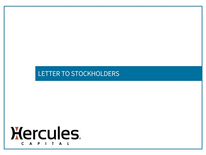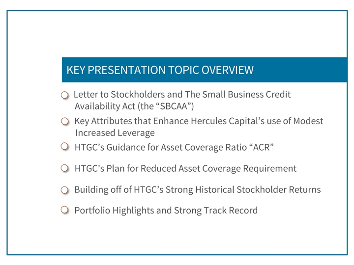 KEY PRESENTATION TOPIC OVERVIEW Letter to Stockholders and The Small Business Credit Availability Act (the “SBCAA”) Key Attributes that Enhance Hercules Capital’s use of Modest Increased Leverage HTGC’s Guidance for Asset Coverage Ratio “ACR” HTGC’s Plan for Reduced Asset Coverage Requirement Building off of HTGC’s Strong Historical Stockholder Returns Portfolio Highlights and Strong Track RecordKEY PRESENTATION TOPIC OVERVIEW Letter to Stockholders and The Small Business Credit Availability Act (the “SBCAA”) Key Attributes that Enhance Hercules Capital’s use of Modest Increased Leverage HTGC’s Guidance for Asset Coverage Ratio “ACR” HTGC’s Plan for Reduced Asset Coverage Requirement Building off of HTGC’s Strong Historical Stockholder Returns Portfolio Highlights and Strong Track Record