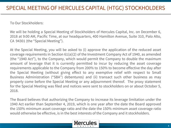 SPECIAL MEETING OF HERCULES CAPITAL (HTGC) STOCKHOLDERS To Our Stockholders: We will be holding a Special Meeting of Stockholders of Hercules Capital, Inc. on December 6, 2018 at 9:00 AM, Pacific Time, at our headquarters, 400 Hamilton Avenue, Suite 310, Palo Alto, CA 94301 (the “Special Meeting”). At the Special Meeting, you will be asked to (i) approve the application of the reduced asset coverage requirements in Section 61(a)(2) of the Investment Company Act of 1940, as amended (the “1940 Act”), to the Company, which would permit the Company to double the maximum amount of leverage that it is currently permitted to incur by reducing the asset coverage requirements applicable to the Company from 200% to 150% to become effective the day after the Special Meeting (without giving effect to any exemptive relief with respect to Small Business Administration (“SBA”) debentures) and (ii) transact such other business as may properly come before the Special Meeting or any adjournment thereof. The proxy statement for the Special Meeting was filed and notices were sent to stockholders on or about October 5, 2018. The Board believes that authorizing the Company to increase its leverage limitation under the 1940 Act earlier than September 4, 2019, which is one year after the date the Board approved the 150% minimum asset coverage ratio and the date the 150% minimum asset coverage ratio would otherwise be effective, is in the best interests of the Company and it stockholders. 5SPECIAL MEETING OF HERCULES CAPITAL (HTGC) STOCKHOLDERS To Our Stockholders: We will be holding a Special Meeting of Stockholders of Hercules Capital, Inc. on December 6, 2018 at 9:00 AM, Pacific Time, at our headquarters, 400 Hamilton Avenue, Suite 310, Palo Alto, CA 94301 (the “Special Meeting”). At the Special Meeting, you will be asked to (i) approve the application of the reduced asset coverage requirements in Section 61(a)(2) of the Investment Company Act of 1940, as amended (the “1940 Act”), to the Company, which would permit the Company to double the maximum amount of leverage that it is currently permitted to incur by reducing the asset coverage requirements applicable to the Company from 200% to 150% to become effective the day after the Special Meeting (without giving effect to any exemptive relief with respect to Small Business Administration (“SBA”) debentures) and (ii) transact such other business as may properly come before the Special Meeting or any adjournment thereof. The proxy statement for the Special Meeting was filed and notices were sent to stockholders on or about October 5, 2018. The Board believes that authorizing the Company to increase its leverage limitation under the 1940 Act earlier than September 4, 2019, which is one year after the date the Board approved the 150% minimum asset coverage ratio and the date the 150% minimum asset coverage ratio would otherwise be effective, is in the best interests of the Company and it stockholders. 5