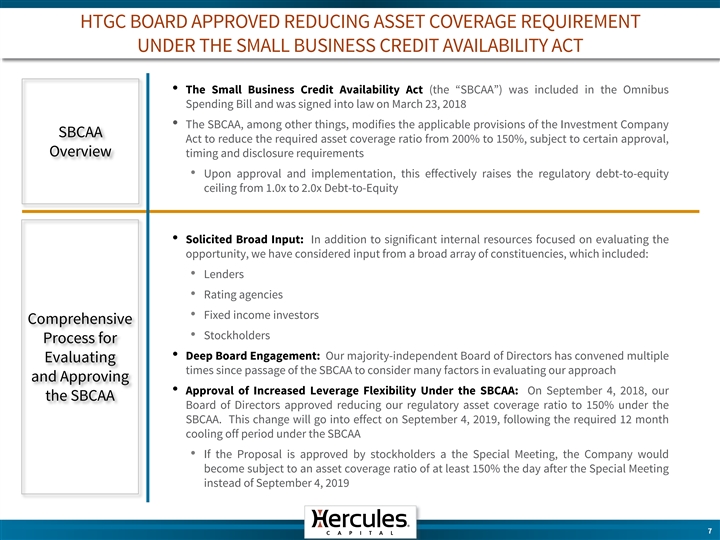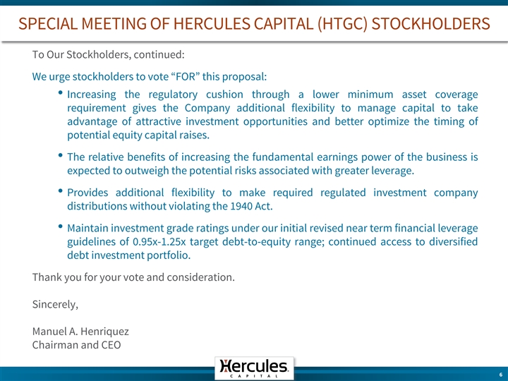 SPECIAL MEETING OF HERCULES CAPITAL (HTGC) STOCKHOLDERS To Our Stockholders, continued: We urge stockholders to vote “FOR” this proposal: • Increasing the regulatory cushion through a lower minimum asset coverage requirement gives the Company additional flexibility to manage capital to take advantage of attractive investment opportunities and better optimize the timing of potential equity capital raises. • The relative benefits of increasing the fundamental earnings power of the business is expected to outweigh the potential risks associated with greater leverage. • Provides additional flexibility to make required regulated investment company distributions without violating the 1940 Act. • Maintain investment grade ratings under our initial revised near term financial leverage guidelines of 0.95x-1.25x target debt-to-equity range; continued access to diversified debt investment portfolio. Thank you for your vote and consideration. Sincerely, Manuel A. Henriquez Chairman and CEO 6SPECIAL MEETING OF HERCULES CAPITAL (HTGC) STOCKHOLDERS To Our Stockholders, continued: We urge stockholders to vote “FOR” this proposal: • Increasing the regulatory cushion through a lower minimum asset coverage requirement gives the Company additional flexibility to manage capital to take advantage of attractive investment opportunities and better optimize the timing of potential equity capital raises. • The relative benefits of increasing the fundamental earnings power of the business is expected to outweigh the potential risks associated with greater leverage. • Provides additional flexibility to make required regulated investment company distributions without violating the 1940 Act. • Maintain investment grade ratings under our initial revised near term financial leverage guidelines of 0.95x-1.25x target debt-to-equity range; continued access to diversified debt investment portfolio. Thank you for your vote and consideration. Sincerely, Manuel A. Henriquez Chairman and CEO 6